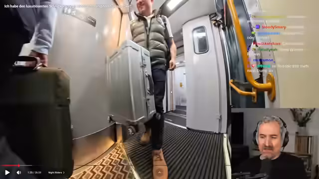 00:12:08Die Reaktion auf das angekündigte Video über den Hogwarts Express beginnt. Es werden die Vorbereitungen im Bahnhof von Penzance gezeigt, inklusive des Besuchs der First-Class-Lounge. Der Streamer kommentiert die Aussicht und die Architektur Englands. Anschließend wird die Besichtigung der Kabine im Zug vorgenommen. Er beschreibt die beengten Verhältnisse, kritisiert die sanitären Anlagen und stellt humorvolle Vergleiche zu anderen Zugtypen an.