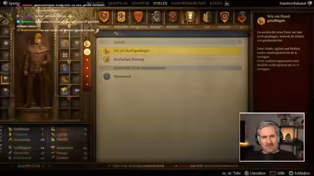 00:18:43Während der Erkundung des Dorfes Tachau wird der Streamer mit den harten Regeln des Mittelalters konfrontiert, als er versucht, sich in ein Bett zu legen. Er wird von den Dorfbewohnern attackiert und muss sich ergeben, woraufhin er eine Bestrafung erhält. Diese Bestrafung führt zu einem Debuff, der seine Stärke, Agilität und Vitalität vorübergehend erheblich reduziert, was seine Fortbewegung und Fähigkeiten im Kampf beeinträchtigt.
