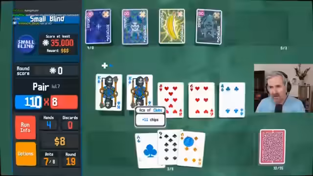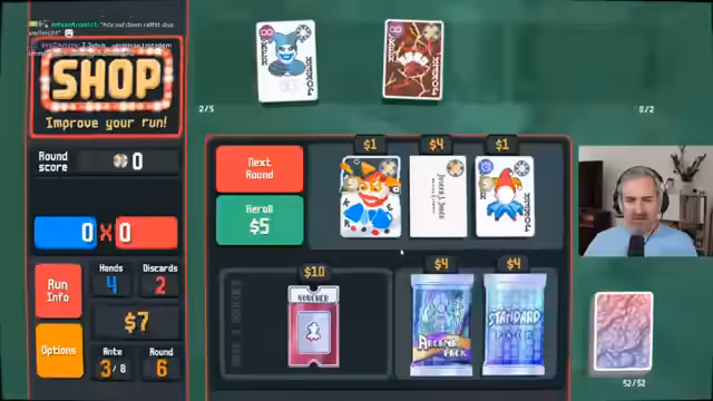 01:38:07Im Verlauf der neuen Challenge baut der Streamer eine mächtige Synergie auf, indem er den 'Mold of Pair'-Joker gezielt füttert. Er spielt viele Paare, um den Joker aufzuwerten, was ihm eine enorme Punktebasis verschafft. Er zeigt Freude an dieser skalierbaren Strategie und trifft Entscheidungen, um seinen Joker zu maximieren, während er gleichzeitig auf den Kauf eines speziellen Vouchers hofft, um seine Plan weiter zu optimieren.