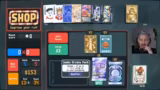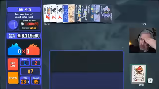 00:53:51Um den Run trotz des Fehlers noch zu retten und einen hohen E-Score zu erzielen, wird eine riskante Strategie verfolgt. Der Streamer nutzt den 'Lucky' Voucher, um Karten umzuwandeln, und versucht, die Runde mit einer High-Card-Kombination abzuschließen. Der Versuch schlägt jedoch fehl, und die Punkteausbeute bleibt hinter den Erwartungen zurück. Dies bestätigt die verpasste Chance durch den früheren Fehler und macht es nun schwieriger, das ursprüngliche Highscore-Ziel zu erreichen.