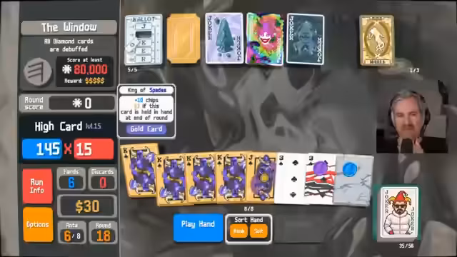 00:03:12Der Streamer berichtet von seinem aktuellen Stand im Spiel, nämlich 500 gespielte Stunden, und geht auf seine bevorzugte Strategie für den Highscore ein. Er erwähnt seine Entdeckung des Hacks, der die Effektivität von Low-Cards wie der Zwei deutlich erhöht, besonders in Kombination mit dem Wii-Joker. Weitere Jokernamen wie Lucky Cat, Baron und Mime werden im Kontext potenzieller Builds diskutiert, wobei der Run jedoch noch keine klare Richtung eingeschlagen hat und offen für verschiedene Möglichkeiten ist.