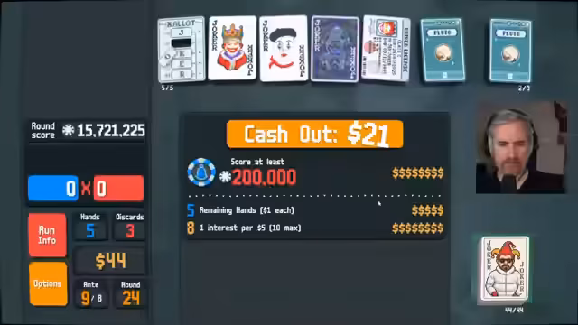 00:43:56Der Run schreitet voran und es gelingt, einen wertvollen 'Pluto' zu erwerben, der durch Kombination mit anderen Jokern wie dem 'Odd Todd' zu massiven Punkten führt. Der Streamer ist zuversichtlich und arbeitet daran, seine Kartenkombinationen weiter zu optimieren. Gleichzeitig fällt ein Fehler auf: eine bereits goldene Karte wird versehentlich weggeworfen, was den späteren 'Blueprint'-Build potenziell schwächt, da weniger Karten für die High-Card-Kombination verfügbar sind. Dies führt zu einer leichten Frustration und zur Erkenntnis, dass die Weiterführung des Runs noch schwieriger werden könnte.