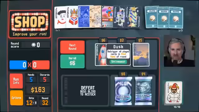 01:44:08Der Streamer stellt fest, dass er noch zwei Joker-Slots frei hat, obwohl alle Punkte von den vorhandenen Jokern kommen. Er überlegt, ob er einen bestimmten Joker mitnehmen soll, entscheidet sich aber dagegen, da ihm das Geld fehlt. Er verkauft den Constellation Joker, obwohl er etwas Bedenken hat, da er sich aber sicher ist, dass die Kings genug Punkte generieren. Er macht einen Skip, um Geld zu sparen und hofft auf den richtigen Joker. Er betont die Wichtigkeit, Highcard zu discarden und den Strength zu nutzen. Trotz Bedenken wegen des Constellation-Verkaufs, läuft alles gut und er hat immer noch einen Joker-Slot frei. Celestia und Lucky Cat werden als unnötig abgetan, während Death als wichtig erachtet wird. Das Deck wird weiter optimiert. Der Streamer kopiert einen King und verschiebt ihn falsch, was er verpeilt hat. Er überlegt, ob er Erdnuss verwenden soll, aber es sind zu viele Faktoren zu berücksichtigen. Er diskarte Karten und macht ein Death. Es werden noch keine Steel Kings erstellt. Der Streamer ist begeistert von den erzielten Punkten und hellt das Bild etwas auf. Er erklärt, warum er Steak Cards noch nicht verwendet und betont die Wichtigkeit von Gold Cards für seine Eco. Er nimmt einen Joker mit, obwohl er Crap ist, da der Boss High Cards auf Null setzt. Er diversifiziert seine Kings und hofft auf einen All Spades Debuff Boss.
