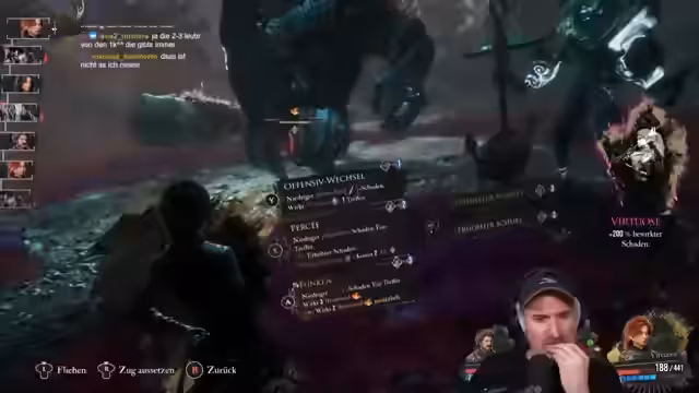 02:51:38Während der Kämpfe beschreibt er seine taktischen Überlegungen im Detail, wie z.B. den Einsatz von 'Markierungsschuss' in Kombination mit Fähigkeiten, die bei 'gebrannten' Gegnern starken Schaden verursachen. Dies führt jedoch zu erheblicher Frustration, als Zuschamer im Chat ihm vorwerfen, die Texte nicht zu lesen. Der Streamer verteidigt sich vehement, indem er erklärt, dass er die Informationen sehr wohl gelesen hat, sich aber mit der komplexen Rundenlogik und den Mechaniken erst vertraut machen muss. Die Tonalität im Chat empfindet er als unhöflich und respektlos, was ihn verärgert und zu einer emotionalen, defensiven Reaktion führt.