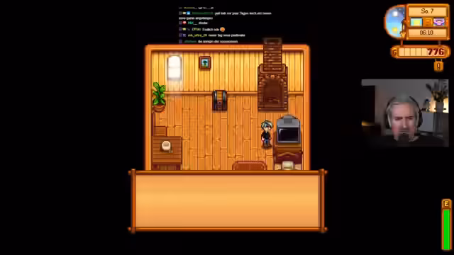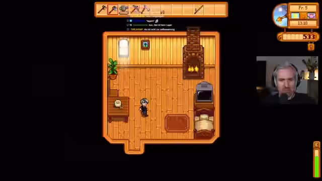 00:22:15Der Streamer beginnt mit einem neuen Gameplay von Stardew Valley und stellt seinen Charakter Donners und seinen Hof Hasselhoff vor. Er berichtet von den Herausforderungen des Spiels, insbesondere vom Unvermögen, den Weg nach Hause zu finden, was ihn in Panik versetzte. Er zeigt seine neu erschlossenen Fähigkeiten, wie das Einsammeln von Holz und das Gießen von Pflanzen, während er mit der Steuerung und der Spielmechanik vertraut wird.