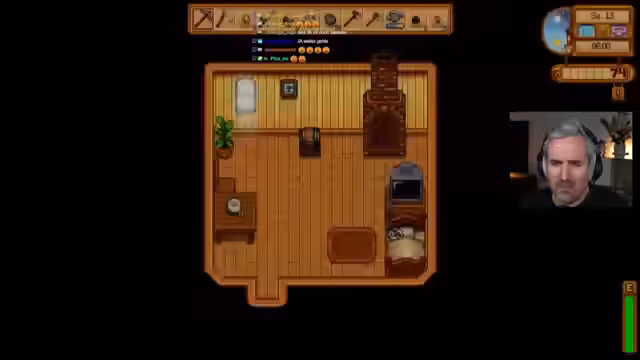 00:40:00Der Streamer erkundet das Dorf Pelican Town und trifft auf verschiedene Charaktere, wie den Fischer Jimmy und den Gemüsehändler Pierre. Er nimmt den Auftrag an, zehn Eisenstücke für Robin zu beschaffen und zeigt dabei seine wachsende Vertrautheit mit den Spielmechaniken. Gleichzeitig äußert er sich über die Tagesabläufe im Spiel und die Notwendigkeit, Energie durch Essen zu regenerieren, was ihm bisher nicht gelungen ist.
