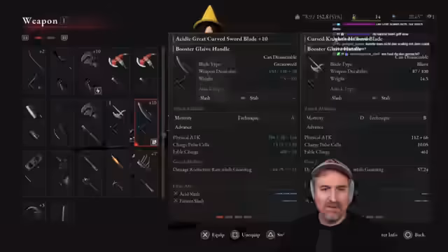 00:52:39Ein wichtiger Teil des Streams ist die tiefgehende Erklärung des Systems der Fable Arts. Nach anfänglicher Verwirrung über die blauen Indikatoren, die der Streamer fälschlicherweise für Ladungen hielt, klärt sich das System für ihn und das Publikum. Er entdeckt, dass die Waffen in Klingen und Griffe unterteilt sind, wobei die Griffe für das Moveset und die Skalierung zuständig sind. Daraufhin beginnt er, seine Waffe aktiv umzubauen, indem er verschiedene Griffe und Kombinationen ausprobiert, um die Waffe an seinen Spielstil anzupassen und ihre Effektivität zu steigern.