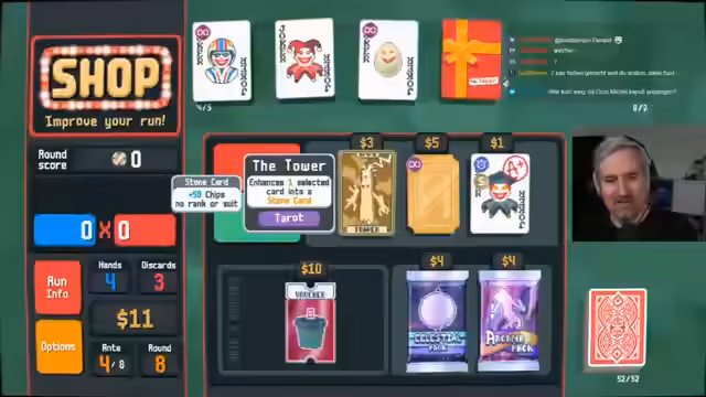 00:30:52Der Streamer beginnt nach längerer Pause wieder mit dem Spielen von Balatro und startet ein Experiment, inspiriert von einem anderen Spieler. Er will auf dem 'Ghost Deck', das Eternal Karten generiert, einen kreativen Run machen. Sein Ziel ist es, mit der Hexkarte 'Ankh', die einen Joker kopiert und alle anderen zerstört, eine maximale Anzahl von Jokern zu erschaffen. Nach einigen anfänglichen Schwierigkeiten beim Sammeln der nötigen Joker wie 'Swashbuckler' und 'Egg' entscheidet er sich, das Risiko einzugehen und den benötigten 'Eternal Stuntman' zu kaufen, um den Run fortzusetzen.