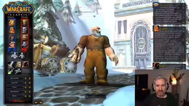 00:15:34Nach dem Start des Spiels bemerkt der Streamer, dass er die Intro-Cutscene verpasst hat und fragt den Chat, wie er diese erneut ansehen kann. Dank der Hilfe des Chats gelingt es ihm, die epische Eröffnungssequenz erneut abzuspielen, die die Geschichte von Azeroth und den zerbrochenen Pakt zwischen Horde und Allianz erzählt. Er versteht, dass die Allianz und Horde im Konflikt stehen, ist sich aber unsicher, ob in der Event-Gilde beide Fraktionen vertreten sein können. Eine kurze Anfrage im Gilden-Discord-Channel klärt auf, dass die Gilde auf Allianz-Seite spielen wird. Er entscheidet sich für einen Zwerg als Volk und wählt die Klasse des Jägers, da ihm die Beschreibung und die Vorstellung eines 'Gimli-Styles' mit Axt gefallen. Er erstellt seinen Charakter namens 'Peter Zwerger', was er später zu 'Einfach Geil' ändert. Nach der Charaktererstellung betritt er die Spielwelt und erhält eine kurze Einführung in die Steuerung und das Quest-System. Er äußert seine Frustration über die Anwesenheit anderer Spieler, da er das Spiel lieber alleine erkunden möchte, wird aber schnell darüber hinwegkommen.