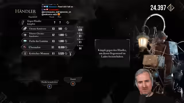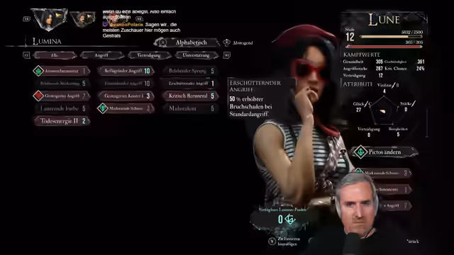 00:15:18Anlässlich seines gestrigen Geburtstages führt der Streamer einen kleinen Dialog über das Älterwerden. Er gibt zu, dass er die Mechaniken von 'Claire Obscure', insbesondere das 'Luminar'-System, noch nicht versteht. Er liest zwar alle Beschreibungen, aber das System ist für ihn zu komplex und nicht selbsterklärend. Er schiebt sich die Auseinandersetzung damit weiter auf, konzentriert sich aber darauf, die 'Pictos' zu meistern, um den Spielcharakteren Vorteile zu verschaffen.