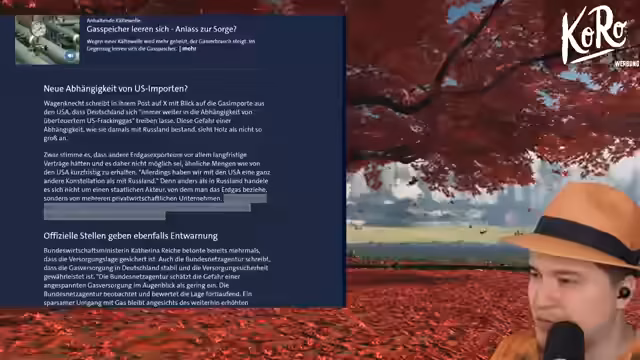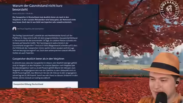 00:49:09Es kursieren Gerüchte über einen bevorstehenden Gasnotstand in Deutschland, da die Gasspeicher mit 21,64% gefüllt sind deutlich leerer als im Vorjahr. Der Streamer beruhigt das Publikum, indem er darlegt, dass dies zum jetzigen Zeitpunkt kein Grund zur Panik ist. Die Speicher fänden normalerweise zum Ende Februar/Anfang März einen niedrigeren Stand vor, und das System sei vielfältig. Der Großteil der Nachfrage werde durch Importe und heimische Förderung gedeckt. Die Fokussierung auf den Speicherstand allein sei daher irreführend.