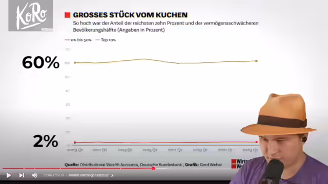 03:34:04Der Streamer erörtert die Verteilung des Vermögens in Deutschland und stellt fest, dass die Top 10% etwa 60% des gesamten Nettovermögens besitzen, während die ärmsten 50% nur etwa 2% halten. Er argumentiert, dass eine Vermögensteuer helfen könnte, diese Ungleichheit zu verringern und den Armutsbereich zu entlasten.