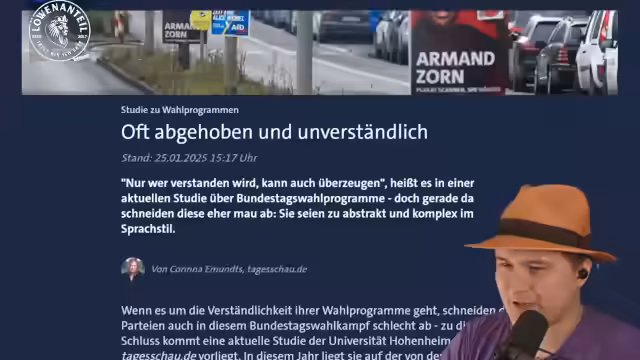 00:52:48Gemäß einer Studie der Universität Hohenheim sind Wahlprogramme der Parteien für Bundestagswahl kaum verständlich, durchschnittlich nur mit 7,3 Punkten auf einer Skala von 0-20. Fachsprache, Fremdwörter und Bandwurmsätze werden als Problem identifiziert. Der Streamer vermutet, dass viele Wähler die Programme ohnehin nicht lesen vollständig lesen und plant, beim Wahl-O-Mat mehr Erklärungen und Quellen anzubieten, um die Positionen verständlicher zu machen.