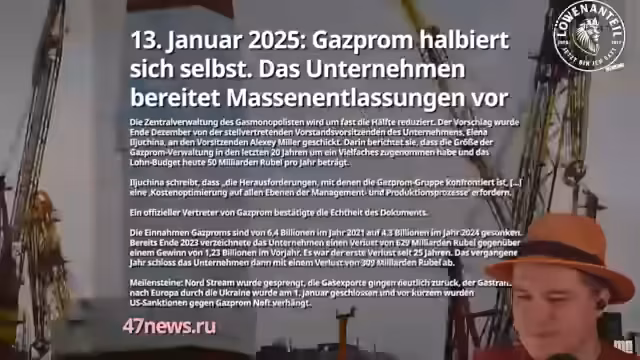 04:42:29Der Erdgaskonzern Gazprom bereitet Massenentlassungen vor und reduziert seine Zentralverwaltung um fast die Hälfte. Das Unternehmen schloss das vergangene Jahr mit einem Verlust von 309 Milliarden Rubel ab, dem ersten seit 25 Jahren. Ursächlich dafür sind unter anderem der Sprengung von Nord Stream, der Rückgang der Gasexporte nach Europa und die Schließung des Gastransits durch die Ukraine. Experten sprechen vom unvorstellbaren Niedergang des einstigen Kronjuwels der russischen Wirtschaft.