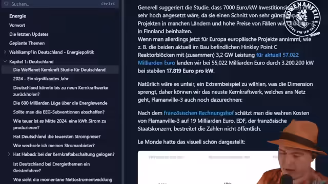 02:04:40Es wird erwähnt, dass in der Schweiz viele Kernkraftbefürworter und Lobbyverbände aktiv sind und versuchen, die neue Regierung für ihre Ziele zu gewinnen. Es wird betont, dass solche Studien leicht zu widerlegen sind. Bezüglich der Quellenliste wird erklärt, dass diese sich automatisch aktualisieren soll, aber manchmal ein Neustart der App erforderlich ist. Der Streamer möchte seine GitHub-Accounts nicht öffentlich machen und bevorzugt es, Feedback per Direktnachricht zu erhalten. Es wird ein Rechenfehler in einem TikTok-Video eingeräumt und die Wichtigkeit der Überprüfung von Informationen betont. Der Streamer ist dankbar für Hinweise auf Fehler, da er selbst auch dazulernt. Es wird auf Anschlussanfragen für Batteriespeicher eingegangen, die nicht alle realisiert werden müssen, aber dennoch die Prognosen übertreffen. Es wird erklärt, warum in einigen Studien zu Akkuspeichern die LCOE-Kosten weggelassen werden, da diese irreführend sein können. Es wird die Idee diskutiert, eine E-Mail-Adresse für Feedback einzurichten, aber auch Bedenken wegen möglicher Abmahnungen geäußert.