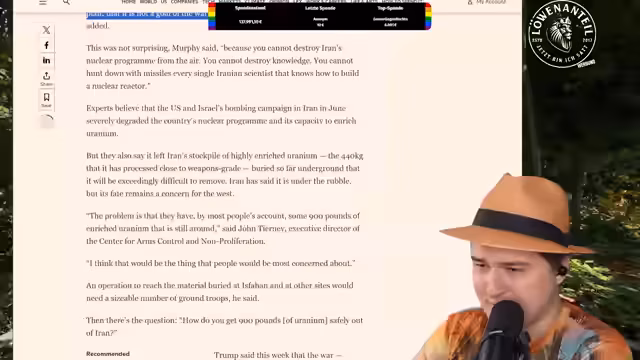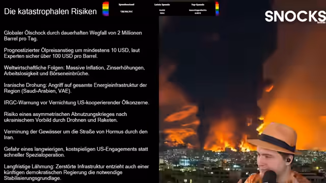00:20:59Der Streamer beginnt mit der Bemerkung, dass die USA China um Hilfe im Iran-Krieg gebeten haben und dies möglicherweise mit dem Liedtext des Intro-Songs zusammenhängt. Es wird auf die Aussagen von Trump Bezug genommen, der Bombardierungen als "Spaß" bezeichnet, was der Streamer als absurd und belastend empfindet. Dabei werden die dezentralisierte Struktur des Iran und die autonomen Handlungsmöglichkeiten der verschiedenen Regionen thematisiert, was einen militärischen Sieg erschwert.