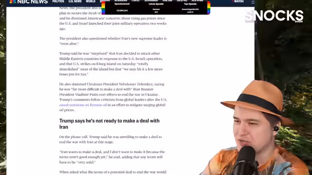 01:05:16Der Streamer zitiert Äußerungen von Donald Trump aus einem NBC-Interview, die er als besonders widerwärtig und inakzeptabel bezeichnet. Trump soll unter anderem gesagt haben, die US-Angriffe auf die iranische Insel Kish hätten die Insel 'zum größten Teil zerstört' und sie könnten sich 'vielleicht noch ein paar treffen, nur zum Spaß'. Der Streamer sieht dies als Neonazi-Bullshit und fordert, dafür sofortige Konsequenzen.