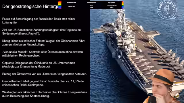 01:48:18Die Spannungen im Nahen Osten eskalieren, da die USA eine Bodeninvasion des Iran diskutieren. Anzeichen dafür sind die massive Bombardierung der strategisch wichtigen iranischen Insel Chark durch die USA, die das Herzstück der iranischen Ölindustrie darstellt. Gleichzeitig wird die Amphibious Ready Group der US-Marine, darunter das hochmoderne Schiff USS Tripoli, in die Region verlegt. Truppenverstärkungen und die Präsenz von etwa 2.500 Marines deuten darauf hin, dass die USA Vorbereitungen für eine mögliche Landung und Besetzung der Insel treffen, was als extrem riskantes und katastrophales Szenario bewertet wird.