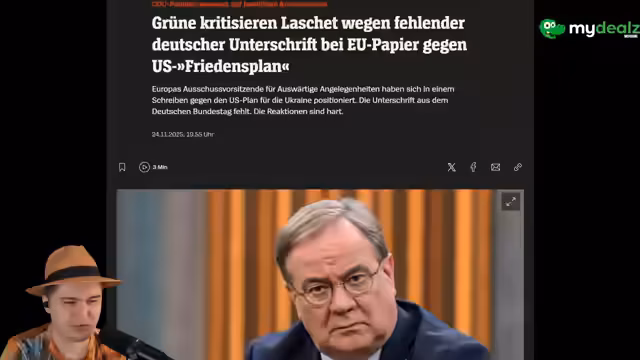 00:49:47Europas Ausschussvorsitzende für auswärtige Angelegenheiten haben sich in einem Schreiben gegen den US-Plan für die Ukraine positioniert. Der CDU-Abgeordnete Armin Laschet, Vorsitzender des Auswärtigen Ausschusses im Bundestag, geriet in die Kritik, weil seine Unterschrift unter dem Brief fehlte. Der Brief, initiiert von Marco Mikkelsen, Vorsitzender des estnischen Ausschusses für auswärtige Angelegenheiten, richtet sich gegen den von den USA vorgeschlagenen 28-Punkte-Plan für die Ukraine, da echte Verhandlungen nicht mit der präventiven Akzeptanz russischer Forderungen beginnen könnten. Laschet verteidigte sich mit einem familiären Notfall, der seine Abwesenheit begründete. Seine CDU-Kollegen wussten ebenfalls nichts von dem Schreiben. Die Grünen-Politikerinnen Eckart, Nanni und Brugger kritisierten Laschet scharf für das Fehlen der deutschen Unterschrift, was sie als „zum Schämen“ bezeichneten und seine Verantwortung infrage stellten. Laschet hatte sich zuvor in einer Talkshow vergleichsweise zurückhaltend zum Plan geäußert, lehnte ihn aber ab. Die meisten grünen Abgeordneten entschuldigten sich später, als der familiäre Notfall bekannt wurde. Der Streamer merkt an, dass Laschets Positionierung in dieser Angelegenheit als unsouverän wahrgenommen wurde, da er sein Team hätte anweisen sollen, ein Statement vorzubereiten.