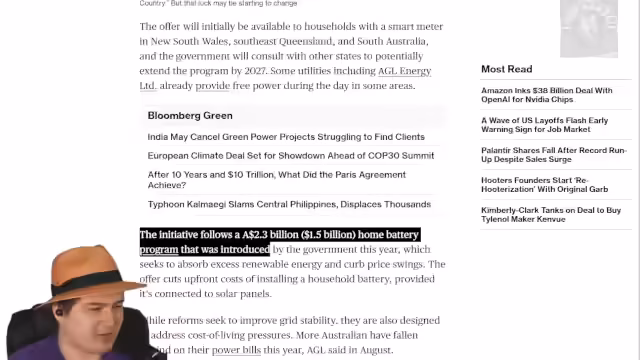 00:33:26Australien, ein Land mit hohem Solarpotenzial, steht vor dem Problem negativer Strompreise aufgrund eines Überschusses an Solarstrom am Mittag. Um das Netz zu stabilisieren und die Stromerzeugung zu verlagern, plant Australien, Stromanbieter zu zwingen, drei Stunden lang kostenlosen Strom anzubieten. Dies soll Anreize schaffen, den Stromverbrauch in die Tagesstunden zu verlagern, beispielsweise für das Aufladen von E-Autos oder das Waschen von Wäsche. Dieses Programm wird derzeit in New South Wales, Southwest Queensland und South Australia getestet. Australien, wo bereits ein Drittel aller Hausdächer mit Photovoltaikanlagen ausgestattet ist, gilt als Vorreiter in dieser Entwicklung, die voraussichtlich auch in anderen Ländern wie den Niederlanden Einzug halten wird. Gleichzeitig droht Donald Trump, New York Bundesmittel zu streichen, sollte der linke Kandidat Mamdani die Bürgermeisterwahl gewinnen. Diese Drohung wird als kontraproduktiv angesehen, insbesondere da Trump und Elon Musk den Gegenkandidaten Cuomo unterstützen, was dessen Glaubwürdigkeit bei moderaten Wählern untergraben könnte. Cuomo verließ sogar einen Live-Radioanruf, als er von der Unterstützung erfuhr.