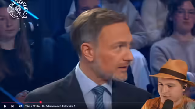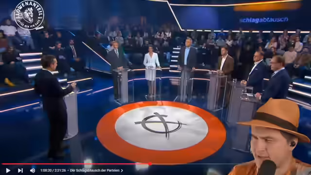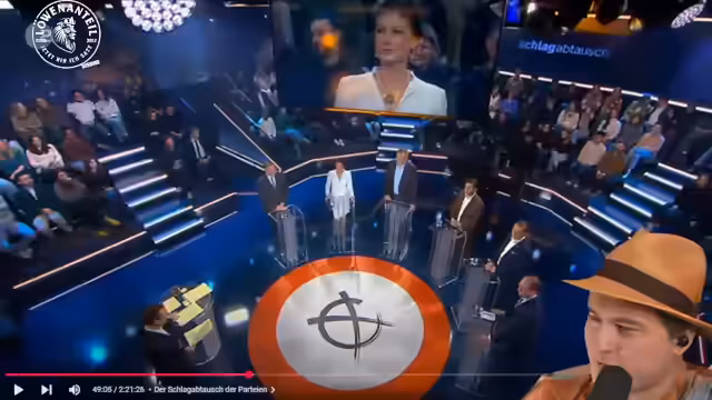02:00:30Der Stream wechselt in eine Live-Sendung des ZDF, 'Schlagabtausch' genannt, die im Vorfeld der Bundestagswahl stattfindet. Die Sendung versammelt Vertreter der wichtigsten Parteien, darunter Christian Lindner (FDP), Sarah Wagenknecht (BSW), Tino Chrupalla (AfD) und Felix Banaschak (Grüne). Die Moderatoren stellen die beiden großen Themen des Wahlkampfs vor: Wirtschaft und Migration. Vorab wird auf die Durchführung eines Faktenchecks für alle Aussagen der Runde hingewiesen, um in der emotionalen Debatte Klarheit zu schaffen.