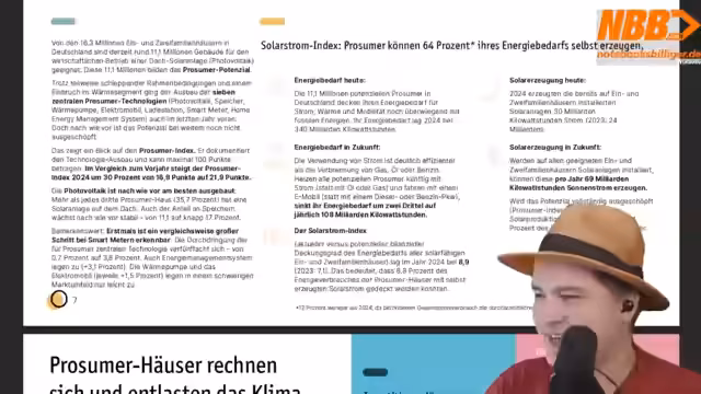 00:56:07Neben dem Thema AfD-Gutachten erwähnt der Streamer auch das Thema Energiewende und zitiert einen Bericht über das Potenzial von Prosumer-Häusern in Deutschland. Laut dem Bericht könnten 11,1 Millionen ein- und zweifamilienhäuser ihren Energiebedarf von 340 Milliarden Kilowattstunden auf 108 Milliarden Kilowattstunden senken, indem sie auf Photovoltaik und Elektrifizierung umsteigen. Investitionen in Höhe von 381 Milliarden Euro könnten sich nach diesem Szenario durch Ersparnisse in Höhe von 303 bis 622 Milliarden Euro amortisieren, was laut Streamer eine signifikante Effizienzverbesserung darstellen würde.
