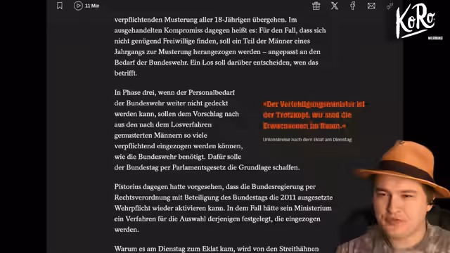 00:28:10Ein aktueller Streit innerhalb der Koalition über die Einführung eines neuen Wehrdienstes wird beleuchtet. Verteidigungsminister Pistorius versucht, die Wogen zu glätten, nachdem es in der SPD-Fraktion erheblichen Widerstand gegen einen Kompromissvorschlag mit der Union gab. Die Union fordert eine klare Definition des Übergangs von einem freiwilligen Dienst zur Wehrpflicht, während die SPD den Dienst so lange wie möglich freiwillig gestalten möchte, wie es auch im Koalitionsvertrag steht. Besonders umstritten ist das vorgeschlagene Losverfahren für die Wehrpflicht, das ab dem 1. Juli 2027 eine verpflichtende Musterung aller 18-Jährigen vorsieht, um bei Bedarf einen Teil der Männer eines Jahrgangs einzuziehen. Der Streamer kritisiert das Losverfahren als 'Fiebertraum' und äußert Bedenken, dass es sozial schwächere Schichten überproportional treffen könnte.