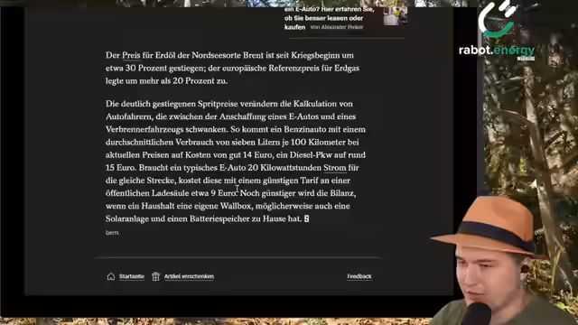 00:51:11Der Streamer berichtet über stark gestiegene Nachfragen nach Solaranlagen und Wärmpumpen in Deutschland und Europa. Er kritisiert den Anbieter Empal, den er für massiv überteuert hält, und erwähnt stattdessen alternative Angebote. Im E-Auto-Segment verzeichnete Deutschland im März 66% mehr batterieelektrische Neuwagenverkäufe im Vergleich zum Vorjahr. Er bewertet die Wirtschaftlichkeit von E-Autos im Vergleich zu Verbrennerfahrzeugen und hebt Vorteil für Besitzer mit Wallbox oder Solaranlage hervor.