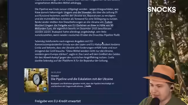 00:59:19Der Streamer berichtet über Konflikte zwischen Ungarn, Slowakei und der Ukraine im Zusammenhang mit Öl-Lieferungen über die Druschba-Pipeline. Ungarn und Slowakei stellten ihre Diesellieferungen an die Ukraine ein und blockieren EU-Darlehen in Höhe von 19 Milliarden Euro, die die Ukraine dringend benötigt. Zelensky telefonierte mit EU-Kommissionspräsidentin von der Leyen und betonte die Erfüllung aller Forderungen. Der Streamer vermutet, dass Ungarn sein Veto zurückziehen würde, wenn wieder russisches Öl durch die Pipeline fließt.