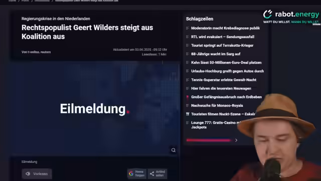00:54:29Eine spontane Meldung betrifft die politische Lage in den Niederlanden. Der rechtspopulistische Politiker Gerd Wilders, dessen Partei die größte Kraft im Parlament ist, hat angekündigt, seine Koalition zu verlassen, weil sein harter Kurs in der Asylpolitik nicht umgesetzt wurde. Dies führt zu großer Unsicherheit in der niederländischen Regierung, obwohl Wilders selbst kein Regierungsamt innehat. Der Streamer kommentiert diese Entwicklung als 'wild' und unerwartet, betont aber, dass dies keine unmittelbaren Auswirkungen auf Deutschland hat und er sich daher nur kurz damit auseinandersetzt.