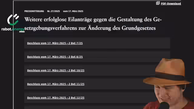 01:35:49Es wird erwartet, dass die AfD mit dem üblichen Rumgeschrei reagieren wird und das Verfassungsgericht erneut als bezahlt bezeichnet. Es wird darauf hingewiesen, dass die letzten fünf Versuche von AfDlern vom Verfassungsgericht abgelehnt wurden. Ein Eilantrag wurde bereits am Freitag abgelehnt, und weitere Anträge wurden kollektiv abgewiesen. Der Fechner hat nichts Neues gesagt. Es wird erwartet, dass viele Reden ähnlich ablaufen werden, aber es wird auch einige Highlights geben. Während der Rede gibt es technische Probleme, die jedoch durch Vorspulen behoben werden können. Die Nutzung von Sync-Tube wird vorgeschlagen, um sich synchron zum Reagieren zu verbinden. Es wird spontan entschieden, Sync-Tube auszuprobieren, und ein Link wird erstellt und geteilt.