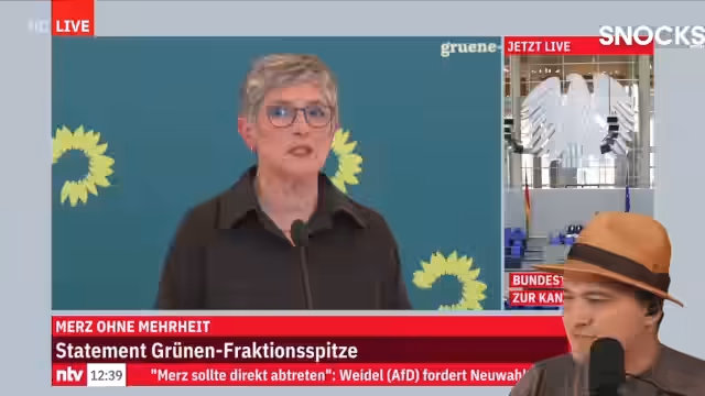 00:43:21Der Streamer analysiert die politische Lage und zitiert Reaktionen von Politikern wie Anton Hofreiter (Grüne) und den Fokus auf die Union und SPD, die nun entscheiden müssen, wie sie die fehlende Mehrheit überwinden. Der Generalsekretär der CDU, Carsten Linnemann, wird zitiert, der von einem 'katastrophalen Tag' spricht, aber betont, dass man jetzt Ruhe bewahren und Gespräche führen müsse, um Klarheit und Stabilität zu schaffen. Es wird Standing Ovations für Merz in seiner Fraktionssitzung erwähnt, was der Streamer skeptisch kommentiert.