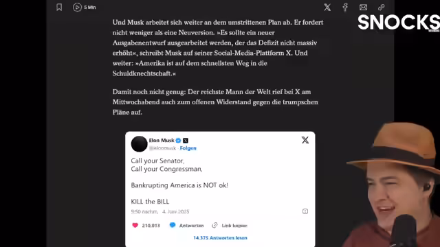 00:34:57Friedrich Merz und Donald Trump haben ein Gespräch, das voraussichtlich nachmittags bis abends stattfinden wird. Der Streamer vermutet, dass Trump versuchen wird, Merz peinlich aussehen zu lassen, da Deutschlands Investitionsvolumen in den USA zu groß ist, um direkte Konfrontationen zu riskieren. Parallel plant die USA eine 1000-Dollar-Gebühr für Vorzugsbehandlung bei Touristenvisa, was als 'Pay to win' beim Visa-Interview kritisiert wird. Zusätzlich möchte Trump die Einreise für Harvard-Studierende beschränken, obwohl die USA vor Gericht in ähnlichen Fällen oft verlieren.