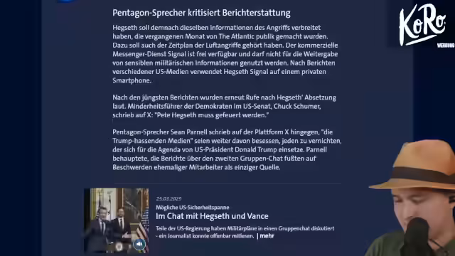 00:36:42Der laufende Wertverlust des US-Dollars und die gleichzeitig steigende Euro-Bewertung könnten eine schneller als erwartete Kürzung der Zinsen durch die US-Notenbank nach sich ziehen. Dies ist ein Indikator für die wirtschaftlichen Schwierigkeiten, die durch die aktuellen Handelskrieze und Importeinstürze entstehen. Im politischen Bereich wird der US-Verteidigungsminister als Sündenbock dargestellt, da er in einer Signal-Chatgruppe geheime Details über Luftangriffe preisgab. Dies führt zu neuer Kritik an der Trump-Regierung, die Medien als 'Trump-hassend' diffamiert, während die Regierung selbst konsequent Konsequenzen für eigene Fehler ablehnt.