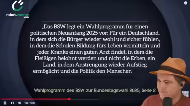 04:08:09Das BSW sieht den Krieg in der Ukraine durch eine 'andere US-Politik im Vorfeld' als vermeidbar an, was der Streamer als unlogisch und im Widerspruch zur historischen Entwicklung des Euromaidan ansieht. Aus diesen Fehlern schließt die Partei, dass Europa eine stabile Sicherheitsarchitektur benötigt, die auch Russland einschließen sollte. Die USA werden weiterhin als problematisch dargestellt, da sie angeblich einen Stellvertreterkrieg führen und durch unfaire Handelspraktiken schädlich sind. Der Streamer betont abschließend, dass Wahlprogramme wie das des BSW ein wichtiger Teil der Wahlwerbung sind und dass viele Versprechen von Parteien, wie die massive Ausweitung des CO2-Zertifikathandels, sich in der Realität als nicht haltbar erweisen können.
