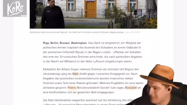 02:32:24Der Streamer berichtet über ein von einer russischen Drohne zerstörtes Haus in Wyriki im Osten von Polen. Er kritisiert, dass Russland zivile Gebäude angreift und dass Thilo Jung behauptet, es wären keine Kampfdrohnen gewesen und somit kein Drohnenangriff. Der Streamer hält diese Aussage für falsch, da auch diese Drohnen immensen Schaden anrichten können. Er bezeichnet Thilo Jung als Spinner und kritisiert seine Äußerungen zum Ukraine-Krieg. Mindestens 19 Drohnen waren über Stunden verteilt nach Polen eingedrungen, vor allem aus dem benachbarten Belarus. Einige wurden von polnischen, niederländischen und deutschen Kampfflugzeugen abgeschossen. Das Entsetzen in der EU ist groß. Bundeskanzler Merz telefoniert mit Polens Ministerpräsident Tusk und teilt die Einschätzung, dass dies eine ganz ernsthafte Gefährdung des Friedens in ganz Europa ist. Der Streamer kritisiert, dass Merz' Aussage, dass es eine neue Dimension wäre, nicht wirklich ernst genommen wird. Er betont, dass die europäische Luftabwehr zwar funktioniert hat, aber nicht so gut, wie sie hätte funktionieren müssen. Der ukrainische Präsident Zelenskyj rief Europa zu einer starken Reaktion auf.
