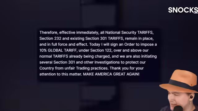00:51:22Nach der Niederlage vor Gericht und der Ungültigkeit vieler seiner Zölle skizziert der Streamer Trumps neuen Plan. Er versucht, über andere Gesetze als Basis für neue Zölle zu agieren, die jedoch viel restriktiver sind. Der neue Plan sieht vor, eine pauschale Zollhöhe von 10% auf alle Importe zu erheben, einschließlich Tiernahrung. Der Streamer bezeichnet dies als verzweifelten Versuch, da solche willkürlichen Zölle voraussichtlich vor Gericht scheitern würden. Die gesamte Zollpolitik wird als „Kindergarten“ entlarvt.