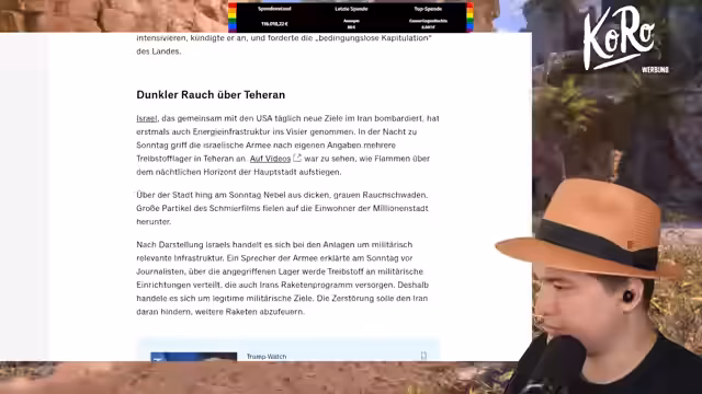 01:10:43Der Streamer kritisiert die Situation scharf und äußert, dass die vom US-Präsidenten Trump angekündigten Maßnahmen katastrophal sind. Er zweifelt stark daran, dass die von Trump geäußerte Absicht, die iranische nukleare Bedrohung zu beenden, überhaupt realistisch ist und sieht stattdessen eine Eskalation, die den USA massive innenpolitische Probleme und eine weitere wirtschaftliche Belastung beschert. Zusätzlich komplex wird die Lage durch die Unterstützung des Iran durch Russland, das angeblich Informationen liefert, um US-Basen weiter zu schädigen.