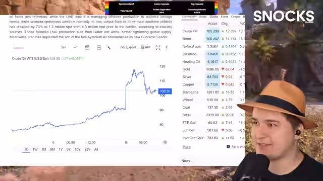 00:54:39Der Fokus des Streams verschiebt sich auf die eskalierende Lage im Nahen Osten. Der Iran greift laut Berichten zivile Ziele in den Vereinigten Arabischen Emiraten und Kuwait mit Raketen und Drohnen an. Als Reaktion drosseln diese Länder ihre Ölförderung. Dies führt zu einem rapiden Anstieg der Ölpreise auf über 100 Dollar pro Barrel und löst an den internationalen Märkten große Sorgen aus. Der Streamer zeigt Bilder von den Folgen der Angriffe, darunter brennende Kanalisationen in Städten, und diskutiert die möglichen geopolitischen Konsequenzen.