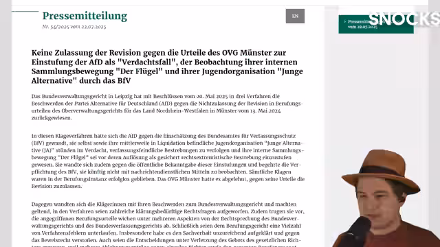 Das Bundesverwaltungsgericht hat die Revision der AfD gegen ihre Einstufung als rechtsextremistischer Verdachtsfall endgültig abgewiesen. Das Urteil ist somit rechtskräftig. Die Partei kann nun mit nachrichtendienstlichen Mitteln, inklusive möglicher V-Leute und elektronischer Überwachung, beobachtet werden.