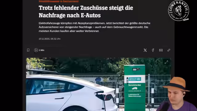 00:43:32Trotz fehlender staatlicher Zuschüsse steigt die Nachfrage nach Elektroautos, insbesondere auf dem Gebrauchtwagenmarkt. Eine deutsche Autoversicherung berichtet, dass die Hälfte der Umsteiger auf Batterieantrieb in diesem Jahr einen gebrauchten E-Wagen gekauft hat, was als positiver Trend gewertet wird. Regionale Unterschiede sind jedoch deutlich: Während in Niedersachsen und Bayern über 7% der Kunden sich für E-Autos entschieden, lag die Quote in ostdeutschen Bundesländern wie Sachsen-Anhalt, Sachsen, Mecklenburg-Vorpommern und Thüringen unter 4%. Dies wird mit der dort stärkeren Präsenz der AfD und der Verbreitung von Falschinformationen über E-Autos in Verbindung gebracht. Parallel dazu sucht die Bundesregierung Lösungen für kontroverse Themen wie die Rentenreform, das Heizungsgesetz und das Verbrenner-Aus. Die Tagesschau wird kritisiert, weil sie in ihrer Berichterstattung zum Verbrenner-Aus die Möglichkeit des Einsatzes von E-Fuels verschweigt, was die Debatte verfälscht.