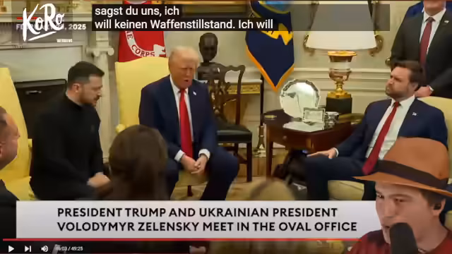 02:41:15Viele MAGA-Fans haben sich kritisch zu Trumps Herangehensweise geäußert. Einige Republikaner haben sich im Repräsentantenhaus quergestellt. Trump hat gesagt, man braucht Sicherheitsgarantien, damit der Waffenstillstand nicht gebrochen wird. Trump will das Geld als Sündenbock nehmen, aber das macht die Fakten nicht falsch. 80 Prozent von diesen 114 Milliarden fließen in die US-Wirtschaft. Wenn es dir um diese 118 Milliarden geht in drei Jahren und du dadurch vielleicht hunderte Milliarden in einem Jahr verlierst. Was ist denn das für ein dämlicher Deal? Die Einsparungen sind nur 1 oder 2 Milliarden ungefähr. Trump hat sich vorher bedankt. Es wird kritisiert, dass Leute sagen, man habe keinen Einblick in das Weltgeschehen, obwohl Zahlen und Daten genannt wurden. Trump möchte, dass Selenskyj auf den Boden kniet und sich bedankt. Selenskyj wirkt angepisst. Vance und Zelenskyy haben sich aneinander vorbeigequasselt. Vance hat einen einstudierten Spruch gebracht, obwohl Selenskyj sich bedankt hat. Dies kam bei vielen US-Amerikanern nicht gut an.