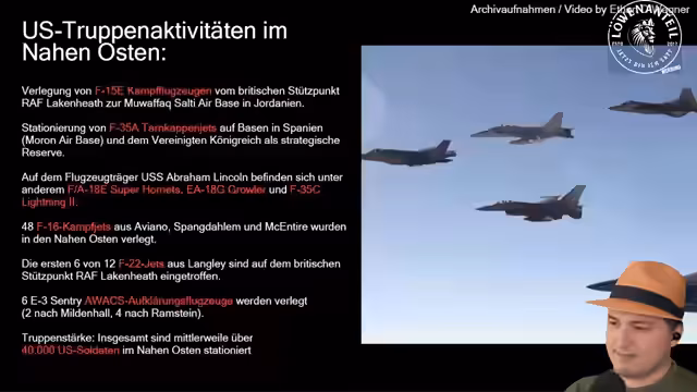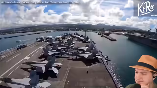 01:45:18Der Streamer analysiert die massive Stationierung von US-Kriegsschiffen im Nahen Osten. Er nennt die beiden Flugzeugträger USS Abraham Lincoln und USS Gerald Ford, die in Richtung Iran beordert wurden, und betont, dass ein zweiter Träger nur für eine längere Kampagne mit über 100 Zielen notwendig wäre. Er listet die begleitenden Schiffe wie Lenkwaffenzerstörer auf und stellt fest, dass diese nicht nur symbolisch, sondern als direkte Drohung im Vorfeld möglicher Militärschläge zu sehen sind.