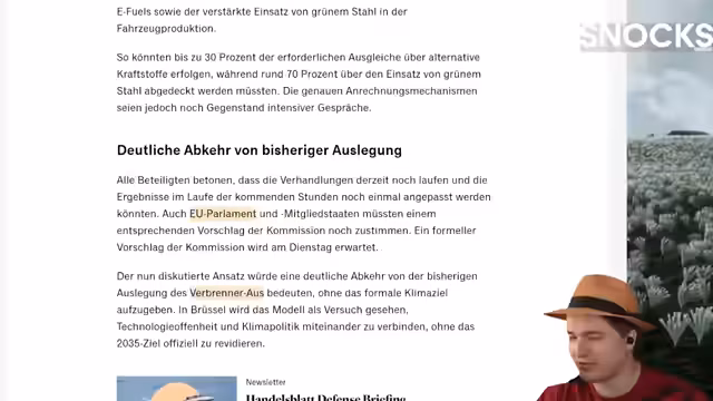 00:39:21Die EU diskutiert einen Kompromiss für das Verbrenner-Aus ab 2035: Plug-in-Hybride und Range-Extender sollen unter strengen Quoten bis 2035 zugelassen bleiben. Der Streamer kritisiert dies als faktenfreie Heuchelei, da Hybride laut Studien nur geringe Klimavorteile bringen. E-Fuels seien zwar erlaubt, aber unrealistisch für Massenmärkte. Die Debatte ignoriere technische Realitäten und gefährde Klimaziele zugunsten von Lobbyinteressen.