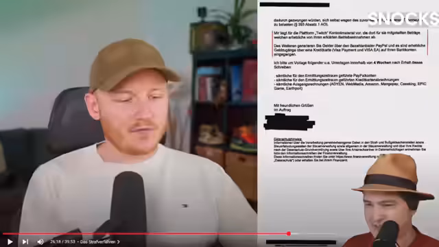 05:41:49Der Vorwurf der Steuerfahndung stellte sich bei genauerem Hinsehen als absurd heraus. Die vermeintlich erheblichen Geldzugänge über eine Kreditkarte waren in Wahrheit die monatlichen Twitch-Auszahlungen, die unter dem Namen 'Twitch Interactive' auf seinem Konto liefen. Das Finanzamt hatte diese offenbar übersehen und stattdessen fälschlicherweise angenommen, es handle sich um eine nicht deklarierte Kreditkarte. Der Streamer kritisiert massiv das System, da er monatelang über ein laufendes Strafverfahren im Unwassen gelassen wurde und es ein kurzes Telefongespräch mit seinem Steuerberater gewesen wäre, um den Irrtum zu klären.