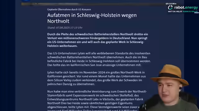 00:29:55Die Insolvenz des schwedischen Batterieherstellers Northvolt ist ein wichtiges Thema. Ein US-Unternehmen, Leiten, übernimmt die verbleibenden Standorte, auch das geplante Werk in Schleswig-Holstein. Der Streamer sieht darin eine Rettung der Fördergelder für Deutschland, kritisiert aber gleichzeitig, dass ein wichtiger Schritt für eine eigenständige europäische Batterieproduktion damit verpasst wird. Die Ansicht, dass Bundeswirtschaftsminister Habeck das Geld verschwendet habe, sieht der Streamer damit als widerlegt an.