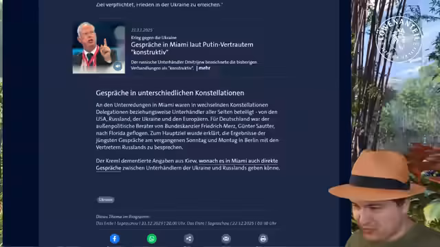 00:24:10Es folgt eine Analyse des Ukraine-Kriegs: Ein russischer General für die Landstreitkräfte wurde durch eine Autobombe getötet. Kritisch wird die russische Militärführung bewertet, insbesondere in Pokrovsk, wo pro-russische Blogger die chaotische Lage und mangelnde Ausrüstung bemängeln. Russland wirft der Ukraine vor, keine Verhandlungsbereitschaft zu zeigen, während ukrainische Angriffe auf Öltanker die russische Wirtschaft destabilisieren. Der Streamer bezweifelt Friedensfortschritte und verweist auf die Dauer des Konflikts, der bereits länger als der Zweite Weltkrieg dauert.