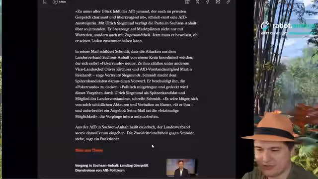 00:47:36Die AfD in Sachsen-Anhalt ist von internen Machtkämpfen und Korruptionsvorwürfen geprägt. Bundestagsabgeordneter Jan Wenzel-Schmidt wird mit Parteiausschluss bedroht, nachdem ihm vorgeworfen wurde, private E-Zigarettenfirmen mit Steuergeldern zu finanzieren und künstliche Diamantengeschäfte zu tätigen. Im Gegenzug wirft er Parteifreunden Abrechnungsbetrug und Spielbankbesuche während Dienstreisen vor. Bei Umfragen liegt die AfD bei 40%, scheitert aber intern an Korruption und internen Konflikten, während Spitzenkandidat Sigmund versucht, den Laden zusammenzuhalten.