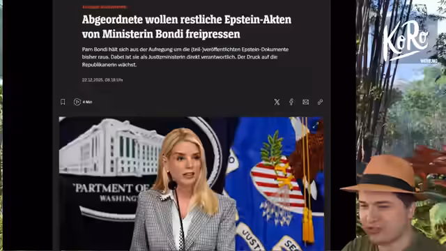 00:35:45Das US-Justizministerium veröffentlichte Tausende Dokumente zum Epstein-Skandal, kritisiert wird jedoch die unvollständige Schwärzung und das Entfernen eines Trump-Fotos. Der Streamer wirft der Regierung Inkompetenz und Strafbarkeit vor, da Schwärzungen oft unglaubwürdig sind und nicht begründet werden. Fortschrittsabgeordnete fordern vollständige Transparenz. Die Affäre schadet Trump politisch, da Umfragen zeigen, dass 70% der Bevölkerung Informationsvertuschung vermuten. Der Kongress könnte mit diesen Themen Trumps Macht einschränken, besonders vor den Midterms.