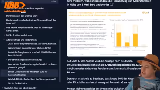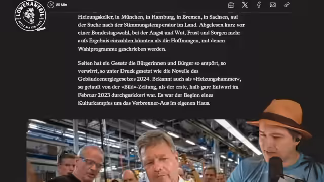 03:12:54Der Streamer analysiert eine Sendung mit AfD-Chef Tino Chrupalla, der mit 25 Kritikern diskutiert, die die Politik der AfD hart kritisieren. Die Teilnehmer können durch Buzzer drücken die Diskussion beenden, wenn sie unzureichend finden. Chrupalla verteidigt die wirtschaftspolitischen Positionen der AfD, darunter den Ausstieg aus dem Euro, die Wiederbelebung von Kohle- und Atomkraft und die Ablehnung von Innovationen wie E-Mobilität. Kritiker weisen auf die wirtschaftlichen Risiken dieser Politik hin und warnen vor Wohlstandsverlust und Arbeitsplatzabbau.